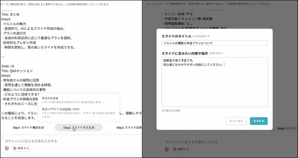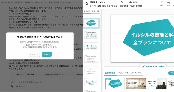 ステップ2で生成された本文を反映するため、「スライド反映ボタン」を押すと、AIが自動でスライドを作成し、最終的な資料が画面上に表示されます。
