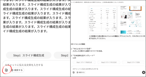 チャット画面左下のクリップアイコンからファイルをアップロードいただけます。アップロード後、入力された内容やご指示に基づき、ファイルの情報が自動的に解析され、スライド作成用のプロンプトが生成されます。