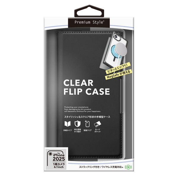 MagSafe対応メタルリングを内蔵したiPhone 16e用 クリアフリップケースです。