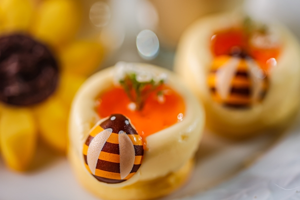 ■メニュー内容:ひまわりクッキー/はちのお家のダブルチーズケーキ/ココナッツミルクの鉢植えパンナコッタ/紅茶とオレンジのオペラ/ひまわりマンゴータルト/さわやかマスカットジュレ/チョコレートマカロン/はちみつレモンのムース/スコーン(ハニーレモンソース)