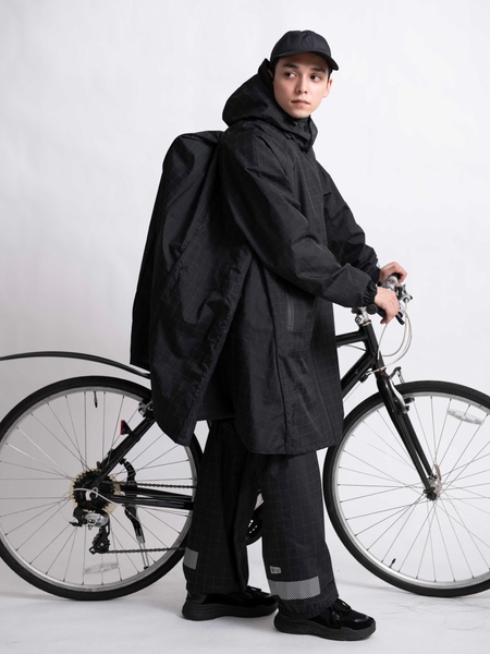夜間走行時に車のライトに反射する総柄リフレクター生地<VISIBLE GRID>を使用。視覚・聴覚・視認性をサポートしつつ、雨から守ってくれるバイシクルポンチョ。4つの着用ステップを行うことで雨の日に起こる乗車時の不快感を軽減します。