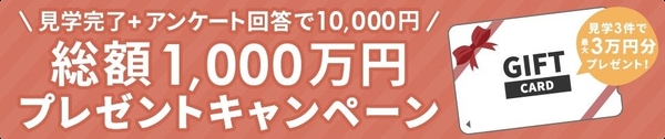 すべての会員(新規会員、過去に見学を実施済みの会員等全て)に向けて、見学1回につきAmazonギフト券10,000円分をプレゼントします。さらに、期間中、最大3回まで適用し、合計で30,000円分のAmazonギフト券を還元します。