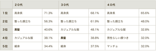 この結果から鑑みると、20代と30代には「カジュアルな服装の長身・細身で黒髪のイケメン」、40代には「カジュアルな服装の長身・マッチョで男らしいイケメン」が、人気のようです。