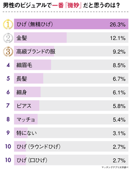 ビジュアル面では、もっとも「自分のタイプではない」特徴も1つ選んでもらいました。結果は「無精ひげ」が26.3%でトップでした。お手入れされていないヒゲに対して清潔感を抱けないという意見が多く見られました。