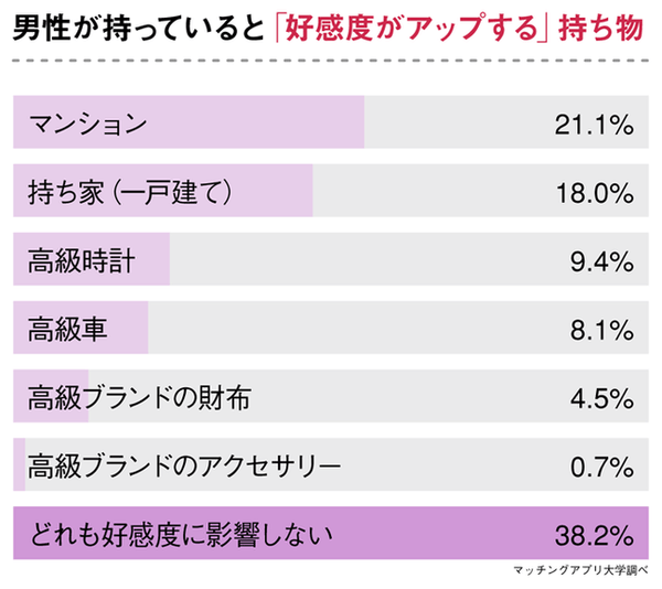 その一方で「どれも好感度に影響しない」が38.2%と最多の表を集めました。約4割の女性が、「高級品を持っているからといってその男性に魅力を感じるわけではない」と考えていることがわかります。