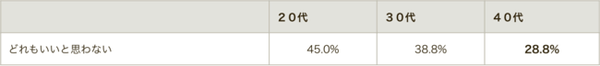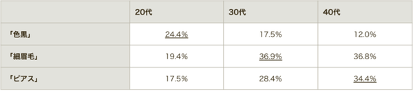 「色黒」を挙げた20代は24.4%で、これは40代の倍以上の数字です。「細眉毛」は30・40代ともに37%近くが「微妙」と回答しましたが、20代では20%弱にとどまっています。また「ピアス」を挙げた40代は20代の倍近くに上ります。調査で理由は聞いていませんが、育った時代背景などが好みに影響しているのかもしれません。