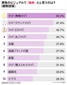 これらの結果から、清潔感があり自然体の男性を、令和の女性は好む傾向にあるといえそうです。また「微妙」だと思う項目をすべて選んでもらった調査でも、同じような傾向が見られました。