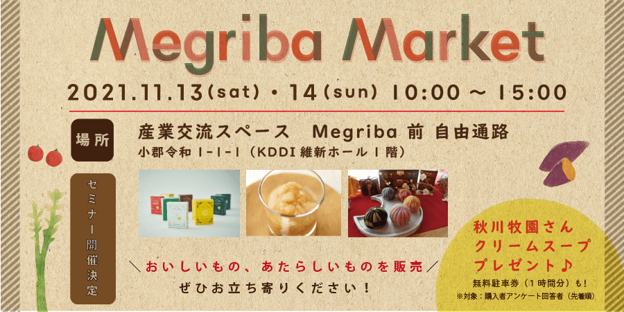 山口市の産業交流スペースMegriba(指定管理者:株式会社ツクリエ)では、当施設として初開催となるマルシェイベント「Megriba Market」を、来る11月13日(土)・14日(日)の10時~15時に、KDDI維新ホールの自由通路を会場として開催します。