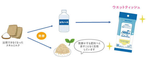 今回、当社は初めてのアップサイクル※として、袋の破損のため出荷できなくなった北海道産のスキムミルクを発酵させ、それをエタノール原料として使用した、天然由来成分99%以上のウエットティッシュを製作しました。ティッシュには、自然環境下で微生物の働きによって分解される、生分解性セルロース素材の不織布が採用されています。