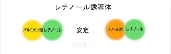 酢酸・パルミチン酸・リノール酸レチノールなどのレチノール誘導体は紫外線や熱に比較的安定で分解されにくく効果を維持しやすく(肌内でもパルミチン酸レチノールの形で蓄えられます)、市販の多くの製品はこれらの誘導体を使っています。