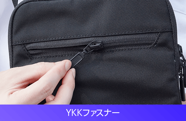 ファスナーを締めると金具が隠れる「止水設計のファスナー」を使用しています。この止水ファスナーはサコッシュの外観をスタイリッシュに見せる役目も果たします。