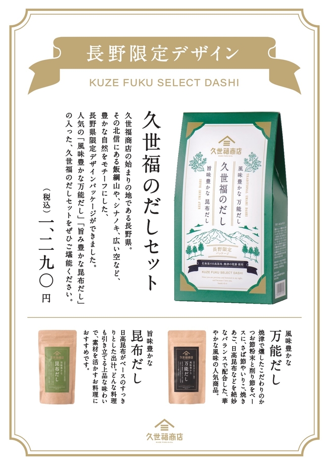 \長野県限定/久世福商店のご当地商品が登場「長野県限定デザイン 久世福のだしセット」新発売!限られた店舗でしかお求めいただけない、お土産にぴったりなプレミアムな商品【久世福商店】