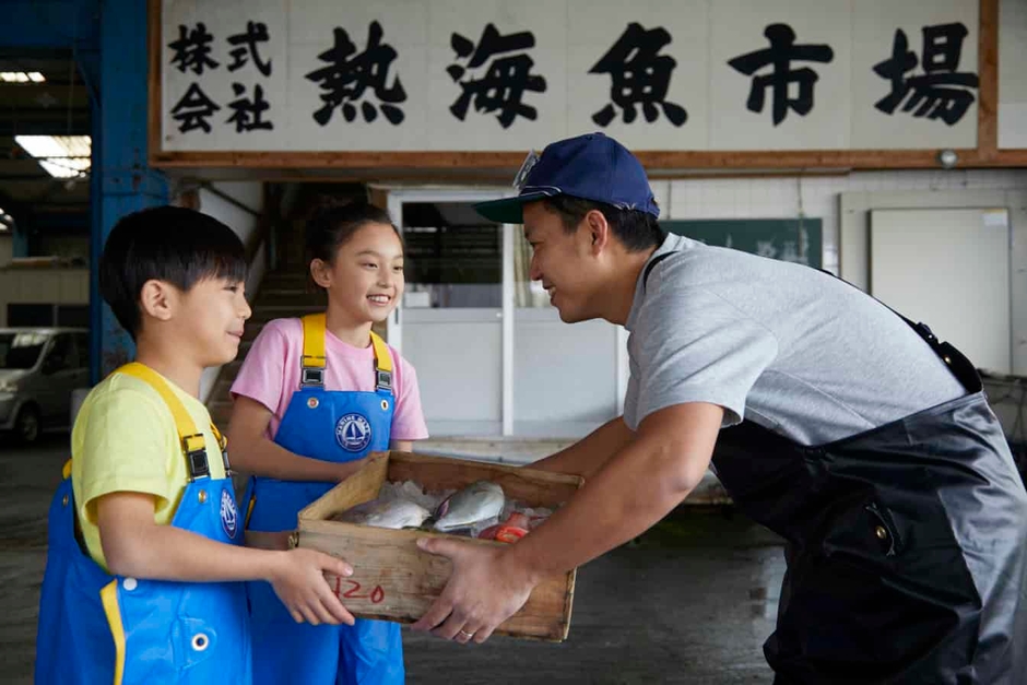 熱海の現役漁師の協力のもと、漁に出て魚を獲り、獲った魚を市場に卸すという漁師の職業体験ができます。漁の前日に漁師と天候や波を見てどのような魚が獲れるのか予測し、網を仕掛けるところから体験します。本格的な漁体験で学んだことや気付いたことを「スイスイワークシート」にまとめて、自由研究の完成です。