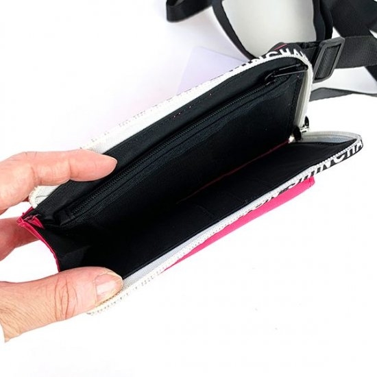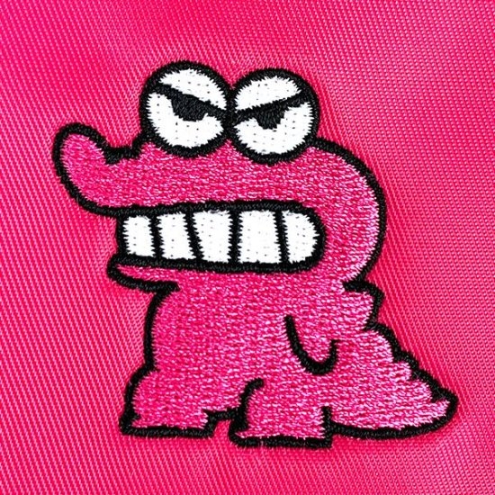 ファスナー部分にはクレヨンしんちゃんの文字が!白黒がビビットなピンクに映えていいアクセントになっています。