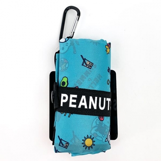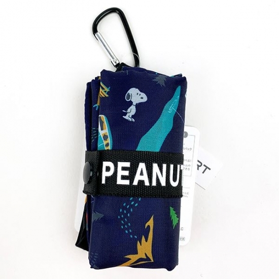 続いては、サマーシリーズのデザイン違いです。ネイビーの背景にキャンプを楽しむスヌーピーたちがデザインされています。カラビナもついているので、バッグにも取り付けられて、すぐに出すことができちゃいますね。