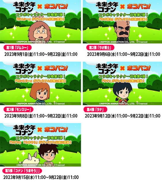 期間中、プレミアム召喚に「コナン」「ラナ」「ジムシー」「ラオ博士」「モンスリー」「うまそう」が登場します!