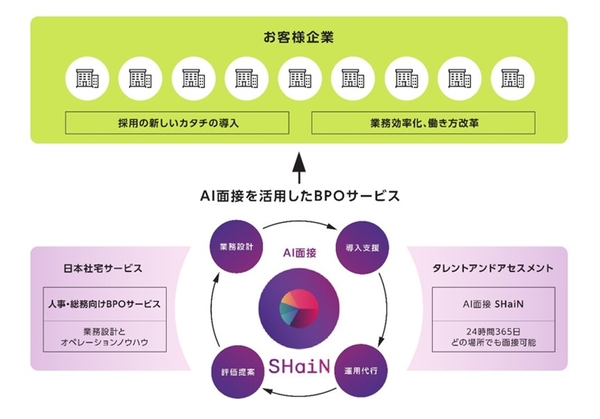 日本社宅サービスが手がける「人事・総務向けBPOサービス」と、タレントアンドアセスメントが提供する対話型AI面接サービス「SHaiN」(シャイン)を組み合わせた共同サービスを開発することにより、AIを活用した最適な採用プロセスとBPOを活用した効率的なオペレーションを実現し、企業ごとに異なる“採用の新しいカタチ”の創造に向け取り組んでまいります。