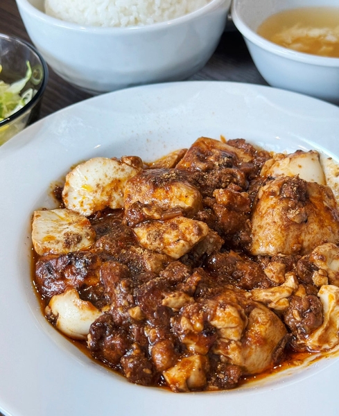 粗めの挽肉で肉々しい麻婆に牡蠣を刻み、貝出汁を加えた麻婆豆腐です。