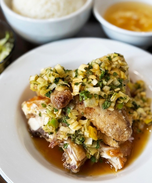 骨ごと揚げることによってお肉が驚くほどジューシーでボリューム満点。あっさりとした塩味の半身揚げに、刻み葱にパセリを加えた甘さ控えめ酸味の効いた香味ダレがよく合います。手で持ってかぶりつくのも旨いです。