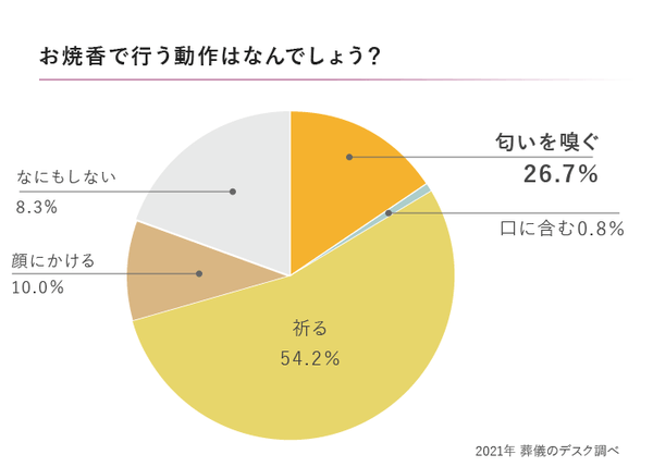 宗教宗派や地域によって「回数の違い」や「そもそも押し頂かない」などの違いはあるものの、「匂いをかぐ」や「口に含む」といっや動作を行うことはありません。正解を選んだ若者はわずか半数でした。葬儀の中でももっとも厳粛な所作なので、こういう勘違いは避けたいものです。