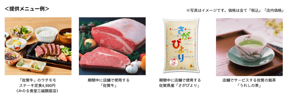 フェアでは、「佐賀牛」を使用した特別メニューや、すべてのご飯を「さがびより」で提供するほか、香り高く500年の歴史を誇る銘茶「うれしの茶」を来店のお客様にサービスします。
