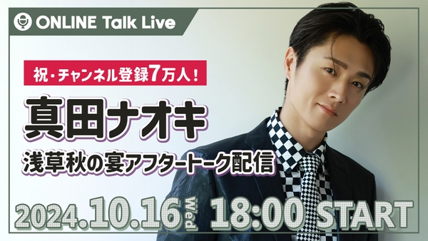 真田ナオキの公式YouTubeチャンネル「真田ナオキチャンネル」が登録者数7万人を突破したことを記念し、10月11日に浅草公会堂で開催された『真田ナオキ 2024浅草秋の宴』を振り返るアフタートーク生配信が決定。配信では、ファンへの感謝を込めて、当日のステージ裏話や感想を語り尽くします。また、11月に発売することが発表されたアルバム「真田ナオキの世界Vol.2~ライブ&カバーズ~」の内容についてもたっぷり紹介予定です。