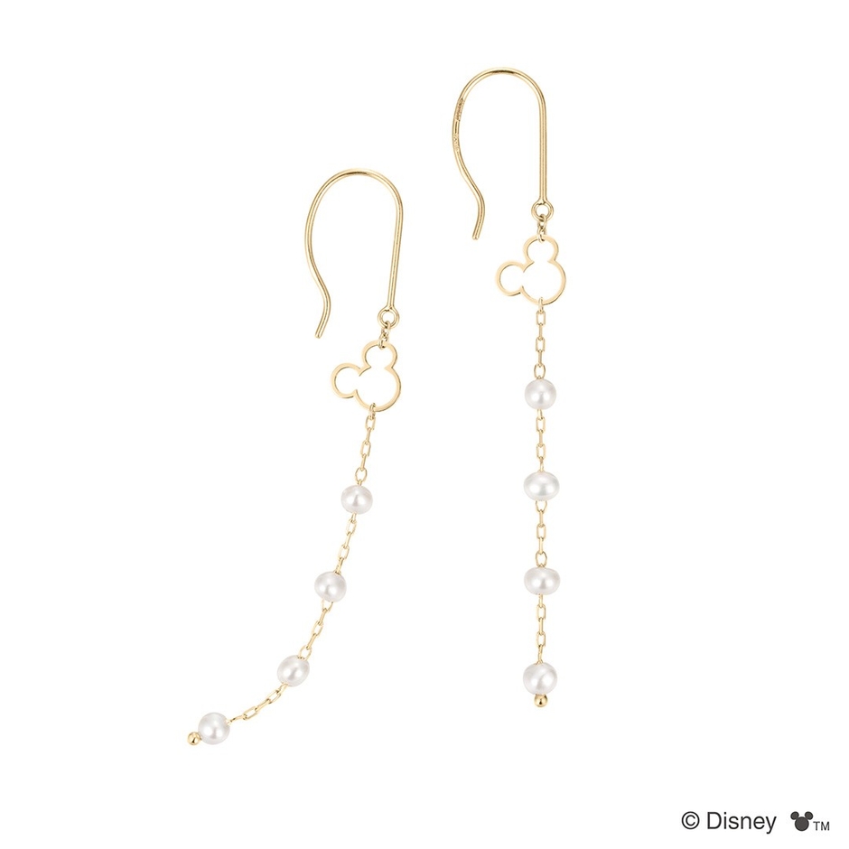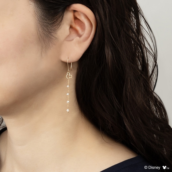 パールと「ミッキー」のアイコンが連なったピアス。天然の淡水パールを使用しており、やわらかな光沢がどこか甘く、優しい印象。耳元でゆれ、顔回りを華やかにしてくれます。まるいパールの中に、みつまるの「ミッキー」がまぎれるように並ぶ、遊び心あるデザインです。デイリーユースからパーティシーンまで幅広く活躍するデザインで、自分用はもちろん、ギフトにも最適です。