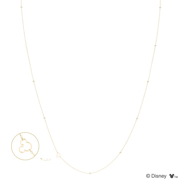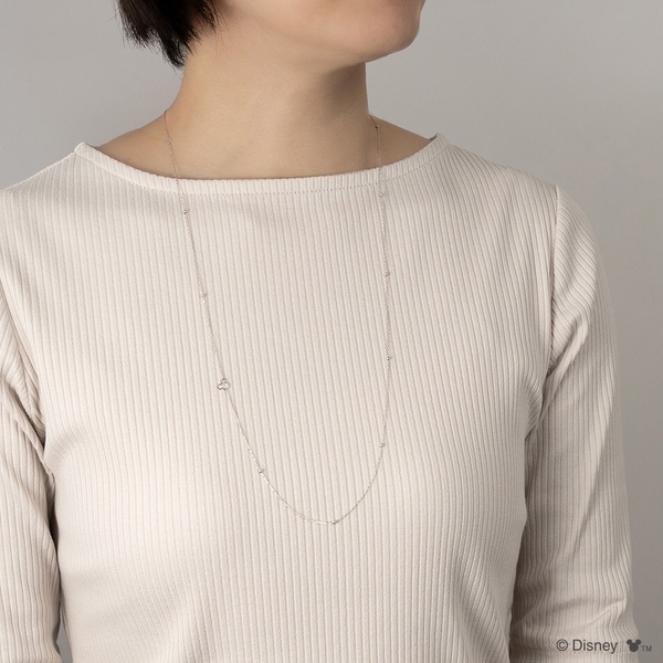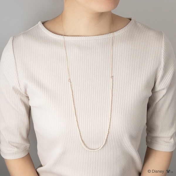 カットボールチェーンに「ミッキー」のアイコンがさりげなくデザインされたロングネックレス。カットボールがミラーボールのようにキラキラと輝き、胸元を華やかな印象にしてくれます。特別な一か所にさりげなくしのばせた「ミッキー」が、日常の中でいつも見守ってくれるようなデザインです。
