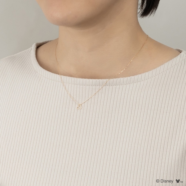 ペンダントトップにシンプルな「ミッキー」のアイコンをデザインしたネックレス。デイリーユースにぴったりなシンプルさで、どんなスタイルにも合わせやすいデザインです。長さは40cmもしくは43cmの2パターンで身に着けることができ、服装に合わせて微調整できる作りにしました。バックチャームには「ミッキー」の手をデザインに取り入れ、シンプルながらも細部までこだわったネックレスです。