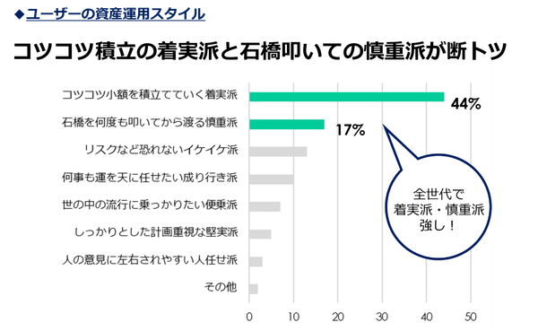 ✔ 来年から始まる新NISA制度やiDeCoへの関心もあってか、ユーザーの資産運用スタ イルは、コツコツ積立の着実派と石橋叩いての慎重派が断トツ