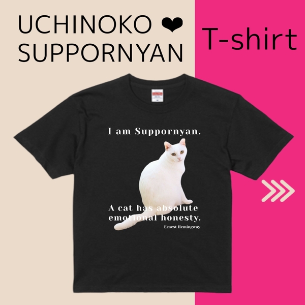 今回の「UCHINOKO ❤︎ SUPPORNYAN T-shirt」では、大の愛猫家アーネスト・ヘミングウェイの名言と愛猫ちゃんがコラボレーション。