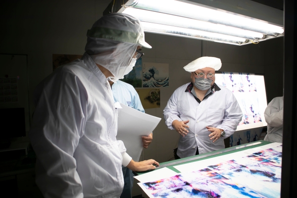 今回、杉山さんが制作したデジタルアート作品『Dance after the rain』を模写するにあたり、杉山さんには実際に印刷現場に立ち会っていただきました。意見交換をしながら再現度を高めていき、光の表現を徹底的にこだわった特色のかけあわせ、色味調整を繰り返しながら完成させました。
