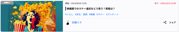 SNSとテクノロジーで社会課題の発見・解決をサポートするPolimill株式会社(ポリミル、本社:東京都港区、代表取締役:横田えり、以下Polimill社)はこのたび、「映画館でのマナー違反をどう思う?実態は?」というイシュー(課題)について10月31日に投票が終了しましたので結果をお知らせします。