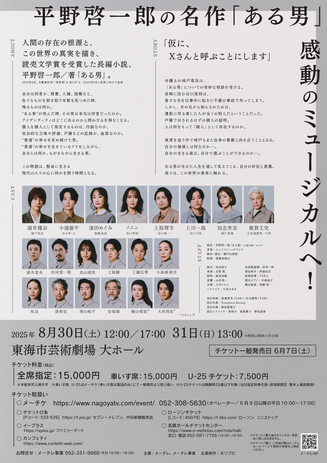 メ~テレ(名古屋テレビ放送)、メ~テレ事業(名古屋テレビ事業)主催、ミュージカル『ある男』が2025年8月30日 (土) 〜 31日 (日)に東海市芸術劇場 大ホール(愛知県東海市大田町下浜田1016 ユウナル東海内)にて上演されます。チケットはカンフェティ(運営:ロングランプランニング株式会社、東京都新宿区、代表取締役:榑松 大剛)にて発売中です。