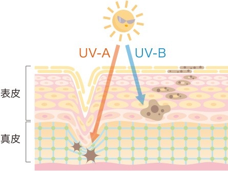 紫外線とは、太陽光線の中でも目に見えない波長の光の一つです。私たちの肌に直接影響のある紫外線はUVAとUVB。UVAは肌の真皮層まで到達し、シミやシワ、たるみの原因になります。UVBは肌表面に影響。肌に炎症を起こしたり、シミ、ソバカスなど肌を黒化する、いわゆる日焼けの原因となります。日焼け止めに書かれているSPFはUVBへの防止効果を、PAはUVAへの防止効果を表す目安で、数値が大きくなるほど防止力が高くなります。