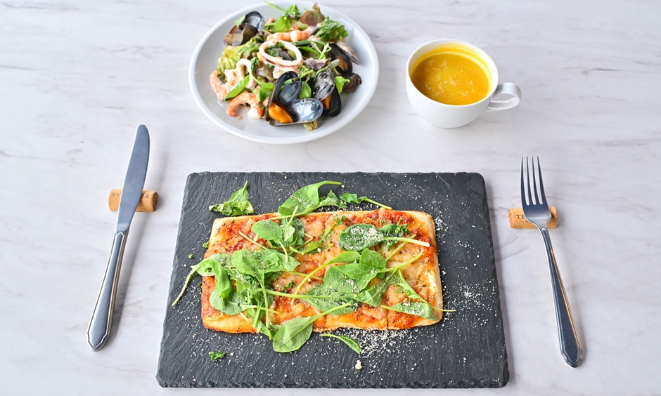 ミニサラダ、クラムチャウダー&バケット、選べるメイン料理(ペスカトーレorトマトガーリックピザ)