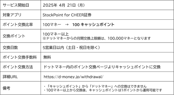 STOCK POINT株式会社(本社:東京都港区、代表取締役社長:土屋 清美、以下「当社」)は、当社が提供するポイント運用アプリ『StockPoint for CHEER証券』において、新たに株式会社サイバーエージェントが提供する「ドットマネー」とのポイント交換を2025年4月21日(月)より開始いたします。