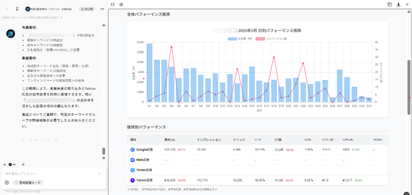 広告運用業務を包括的に支援するAIエージェントです。BigQuery連携による自動データ取得から、分析、レポーティングまでを一気通貫で実行します。