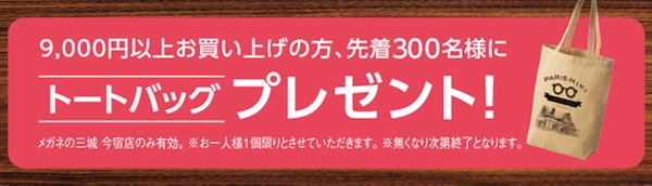 オープン記念としまして、9,000円(税込)以上お買い上げの方 先着300名様に、パリミキオリジナル トートバッグをプレゼントいたします。便利なマイバッグとして活躍まちがいなしですので、どうぞこの機会にゲットしてください!