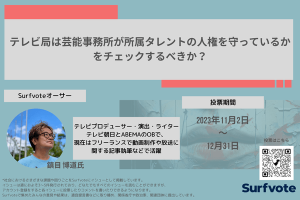 テレビ朝日とABEMAでプロデューサーも務めた鎮目博道氏が本気で世間に問う。テレビ局は芸能事務所が所属タレントの人権を守っているかをチェックするべきか?「Surfvote」で意見投票を募集。