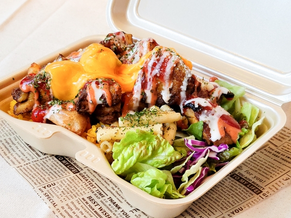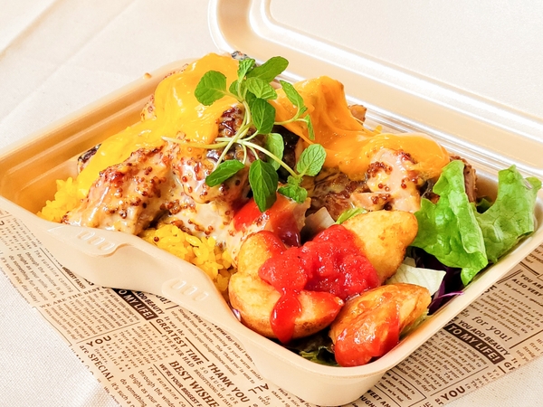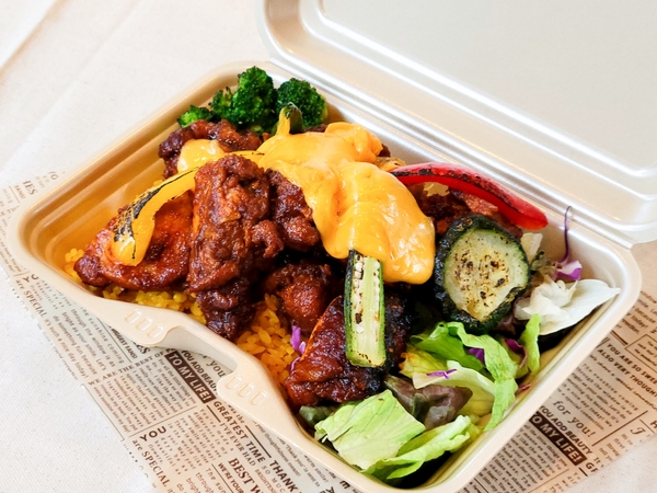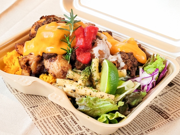 人気のチキンライス4種にとろ~りチェダーチーズをトッピング。さらにライス、肉大盛りでボリュームも満点♪購入はテイクアウト、デリバリー各種サイトで可能。