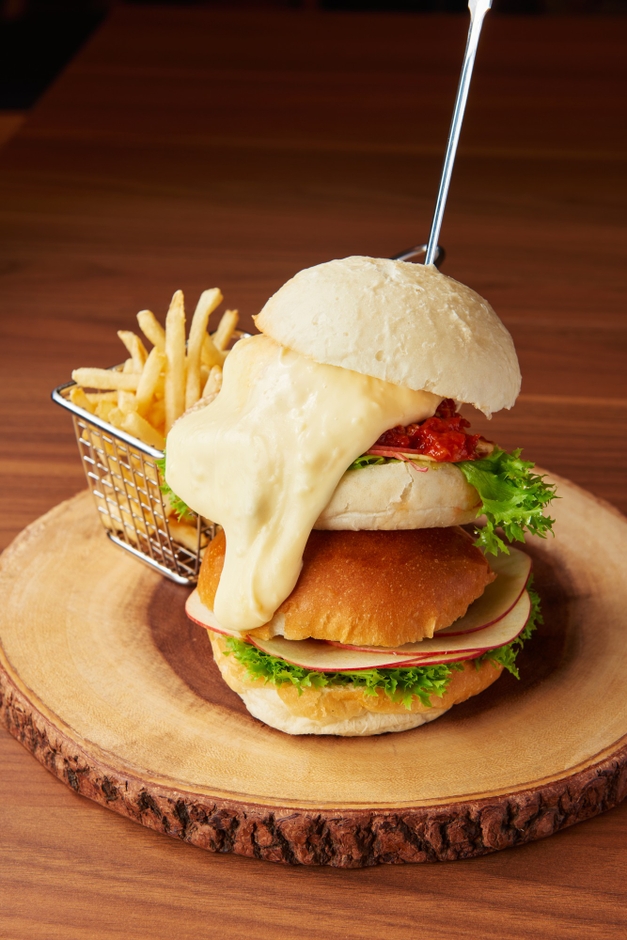 志賀高原の雪景色をイメージした、白銀バンズ&とろけるチーズ。信州牛・りんご・地元野菜を使った、地産地消のごちそうバーガーです。