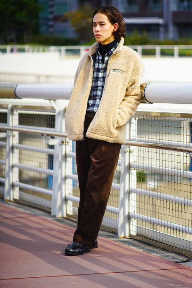 胸の切り替えポケットを外し、よりシンプルなレトロカーディガン風な見た目に別注。フィットはやや広めのクラシックフィットに修正し、レイヤードもしやすいサイズ感でメインアウターとしても着用できます。