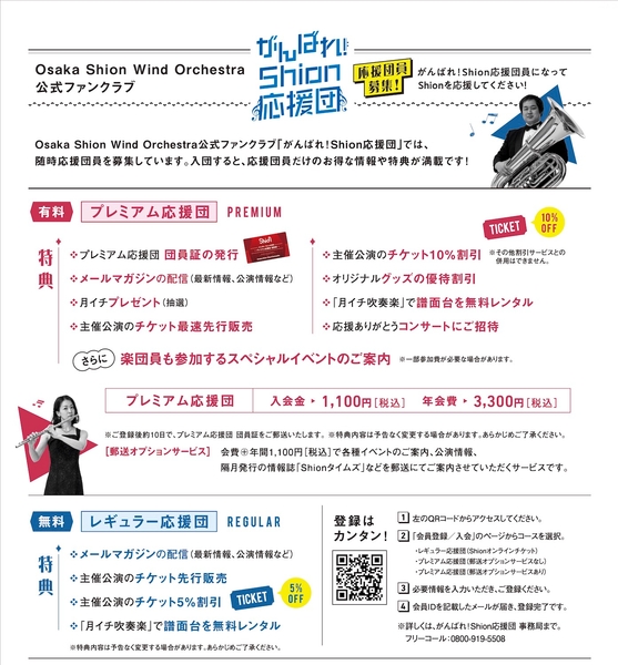 <がんばれ!Shion応援団レギュラー応援団>に加入すると、一般に先駆けてチケット購入ができ、5%引きの特典も!