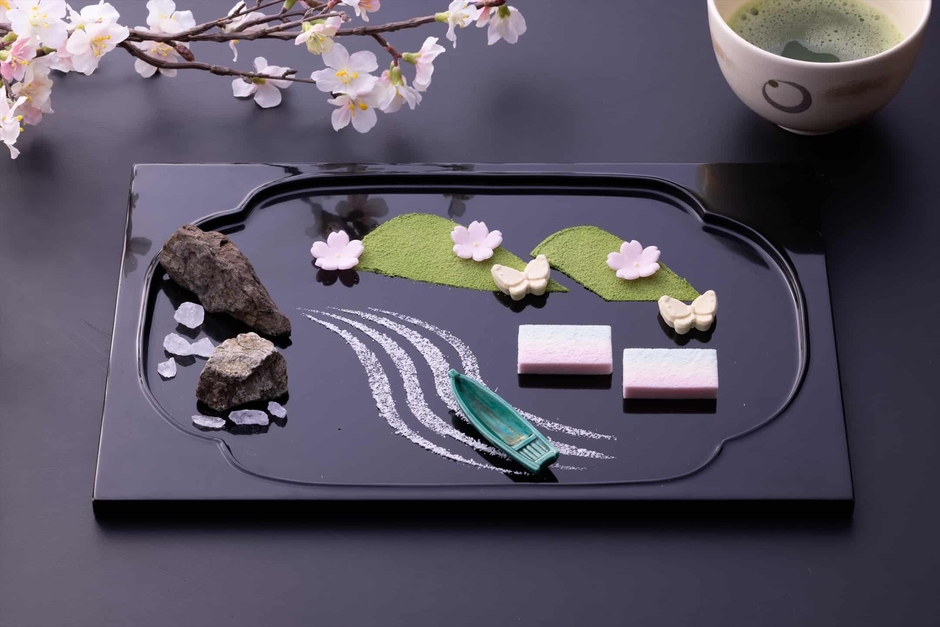 雅な屋形船「翡翠」の中では抹茶とともに、盆景桜菓を味わいます。盆景とは、盆上にあらゆる大自然の情景を立体的に表現してその美と寂(さび)をめでる日本独特の風流なあそびです。桜や蝶といった、桜の時期ならではの和菓子で目の前に広がる嵐山の情景を表現しています。これらの和菓子は1803年創業の和菓子店「亀屋良長(かめやよしなが)」がこのアクティビティのために作ったオリジナルです。舟からの一期一会の景色を眺めながら、盆景桜菓と抹茶を味わうことで優雅な気持ちになることができます。