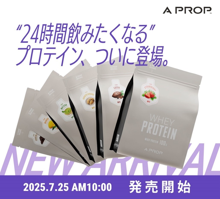 今回発売する「A PROP WHEY PROTEIN」は、たんぱく質の理想形とも称されるWHEY 100% 、アミノ酸スコア100%の高品質プロテインです。フレーバーはプレミアムチョコレート、ココア、ストロベリー、マンゴー、黒糖きなこ、抹茶の6種類。飲むのが楽しみになるよう設計された味わいは、スイーツ感覚のやさしい味となっており、飲み心地を楽しめる“ごほうび”感覚のプロテインです。
