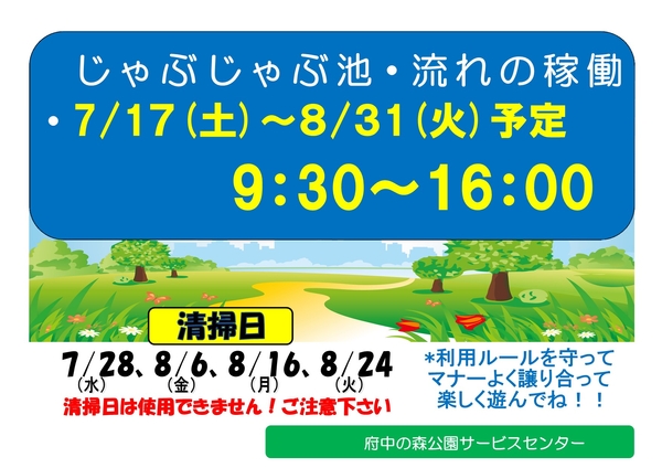 ※2021年度は終了しました※【府中の森公園】「じゃぶじゃぶ池」「流れ」稼働のお知らせ 7/17~8/31
