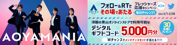 青山商事株式会社(本社:広島県福山市/代表取締役社長:青山理(おさむ))は、フレッシャーズ応援Twitterキャンペーン第2弾を2月1日(火)10:00から開催します。今回の第2弾では、フォロー&リツイートキャンペーンとハッシュタグツイートキャンペーンの2種類を企画し、参加いただいた方の中から抽選で5,000円分のデジタルギフトコードやスーツ・シューズのメンテナンスセットをプレゼント。第1弾に引き続きフレッシャーズの新生活を応援する内容となっております。