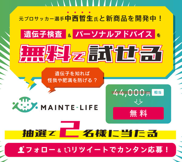 遺伝子検査を活用したあなたに合った・あなただけのパーソナルサポート「メンテライフ:MainteLife」サービスを提供する株式会社 BIRTH(本社:東京都大田区、代表取締役:町田慶太 )は、2022年サービス提供スタート予定のN14メソッドを開発した中西哲生氏とコラボ商品を現在開発中です。一般消費者の意見を開発に取り入れる為、今回無料の遺伝子検査と専門家によるパーソナルアドバイスを体験して頂くモニター募集キャンペーンを実施致します。
