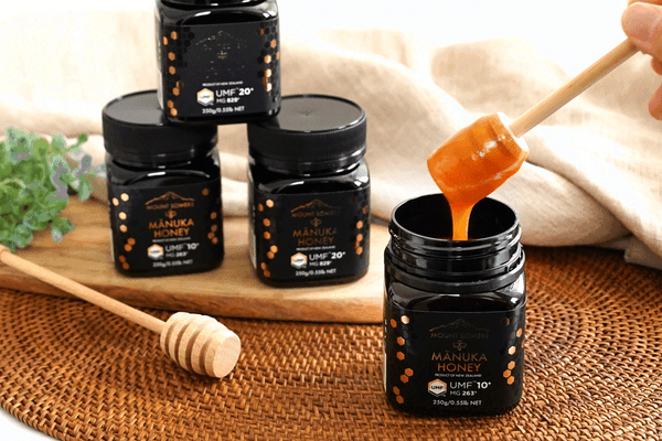 マヌカハニーは、マヌカ(マオリ語で「復活の木・癒しの木」という意味)という木の花からミツバチによってつくられた蜂蜜です。ニュージーランドの先住民族・マオリ族は古来よりマヌカハニーを伝統的な健康食品、薬として使用していました。他の蜂蜜と異なる最大の特徴は、天然の抗菌物質「メチルグリオキサール」が多く含まれているということです。一般的な蜂蜜もビタミンやミネラルなど体に必要な栄養成分が100種類以上含まれるスーパーフードですが、マヌカハニーはさらに高い抗菌作用が期待されています。また、蜂蜜は消化吸収が早く、効率的にエネルギーチャージできるため、長時間勉強する際にも役立ちます。高い抗菌作用で健康をケアし、疲れた体や脳に素早くエネルギーを補給してくれるマヌカハニーは、体調を崩しがちな季節や受験生の心強い味方としてもおススメです。